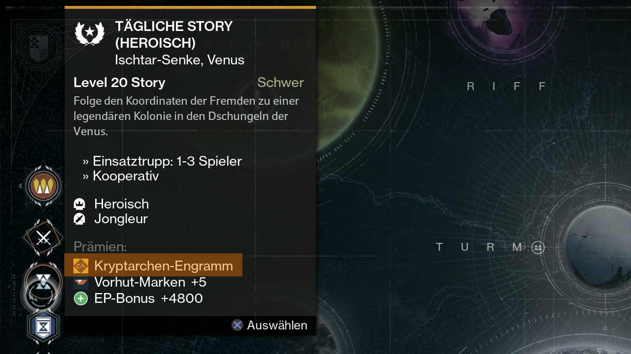 Die Chance auf legendäre Engramme besteht bei der Tagesmission einmal pro Tag und bei der Wochenmission einmal pro Woche. Eine Glücks-Garantie gibt es aber nach wie vor nicht.