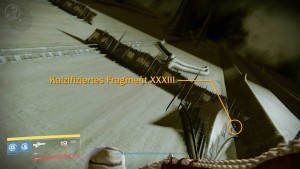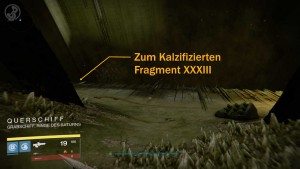 Ehe es zur nächsten Schatztruhe und dem Ausgang geht, solltet ihr noch das 33. kalzifizierte Fragment (XXXIII) einsammeln. Geht auf der Start-Plattform des Querschiffs ein wenig nach links, bis ihr kurz vor dem Rammbock steht. Dreht euch nach rechts um und geht vorsichtig zur Kante. Blickt nun nach unten auf die Plattform unter euch. Das Fragment liegt auf dieser Plattform an der rechten Kante neben einem weiteren Rammbock.