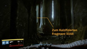Nachdem ihr den kräftigen Oger Golgoroth bezwungen habt, könnt ihr den Bossraum verlassen. Biegt an der zweiten hell erleuchteten Kreuzung links ab. Hinter der Tür liegt oben auf einem Felsvorsprung das 32. kalzifizierte Fragment (XXXII).