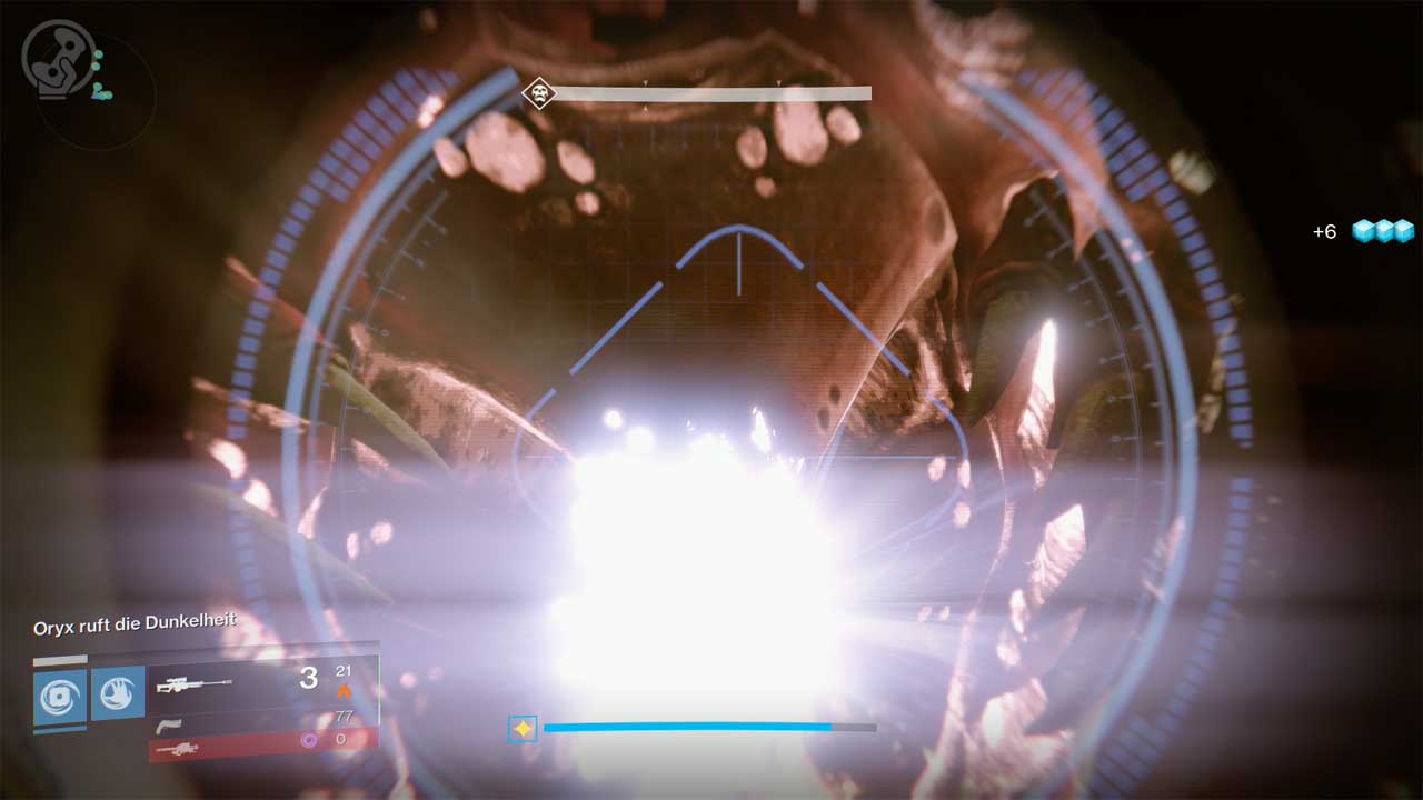 Lehnt sich Oryx dagegen nicht zurück, sondern beugt sich nach vorn, habt ihr Pech. Oryx beschwört vor sich eine Kugel und fängt hier zufällig ausgewählte Spieler ein. Wie in der letzten Phase der Story-Mission Königsmord müsst ihr hier einen Mini-Oryx – den Schatten von Oryx – innerhalb der Kuppel besiegen. Ihr könnt ihn zwar verwunden, wenn er sich außerhalb befindet, er ist aber sehr schwer zu erkennen und wechselt ständig seine Position. Ab und zu fliegt er im Sturzflug auf euch zu. Trefft ihn schnell und schwer, denn ihr habt nur wenig Zeit, den Mini-Oryx zu erledigen.